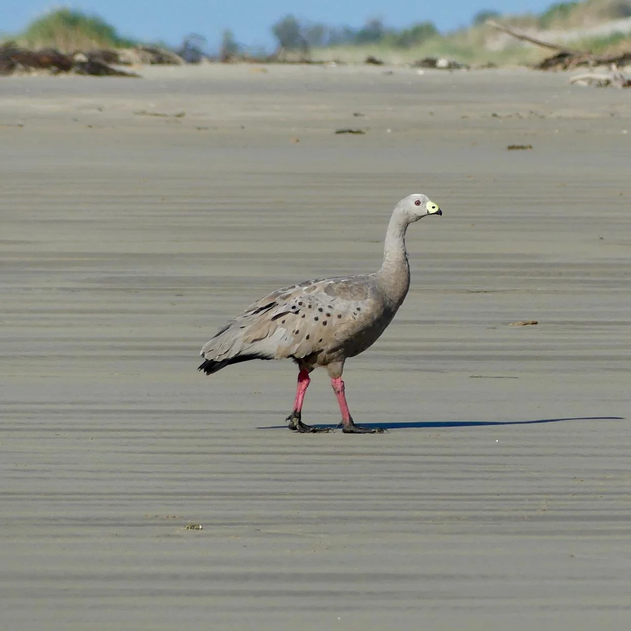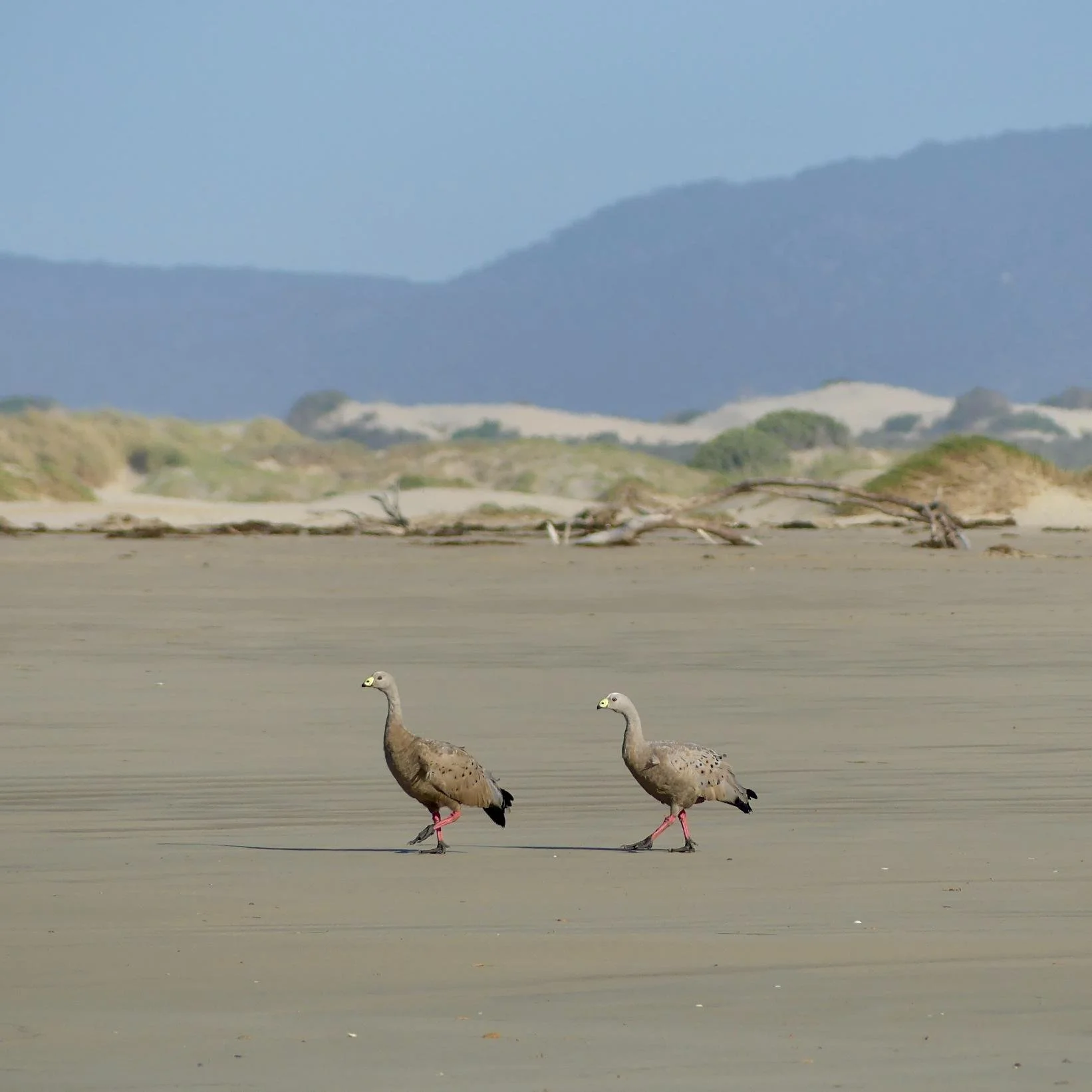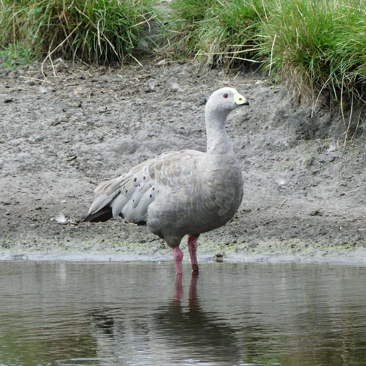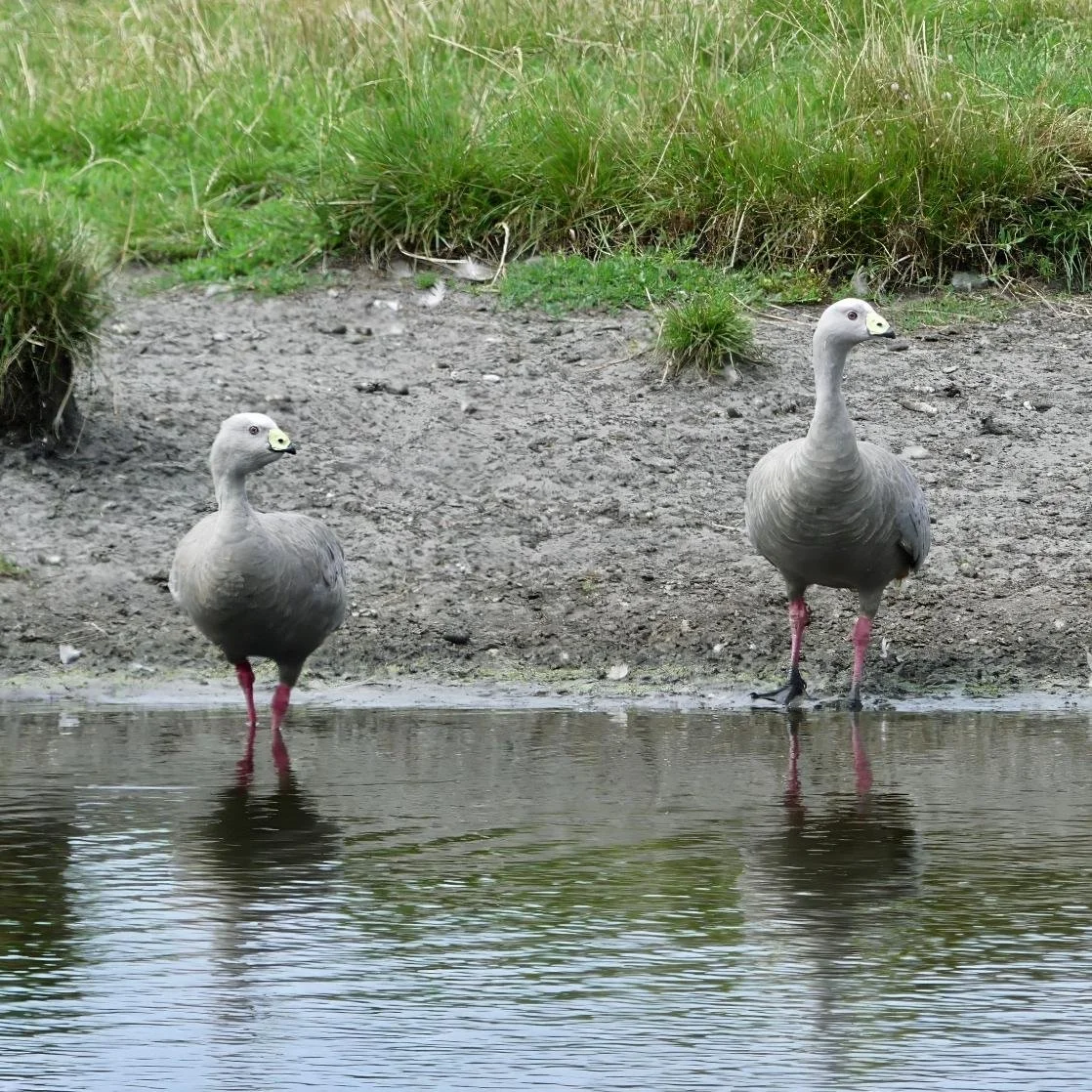 Large prehistoric looking grey geese, they have stout pink legs with big claws on their webbed feet.
