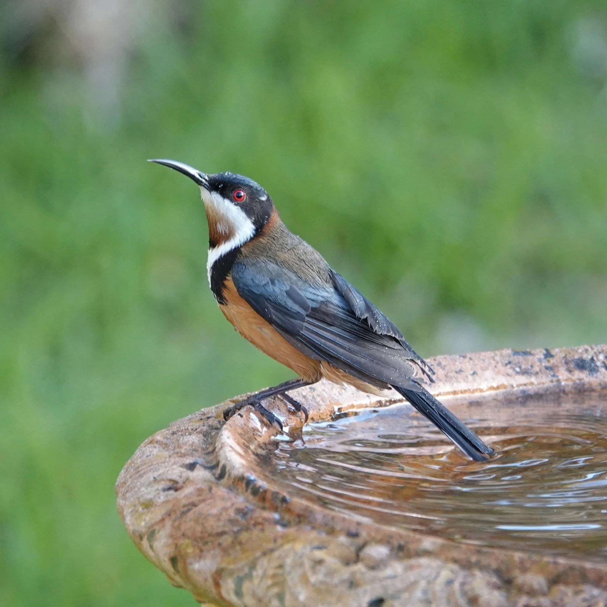 The female has a dark brown eyes and is plainer, lacking the striking black feathers.