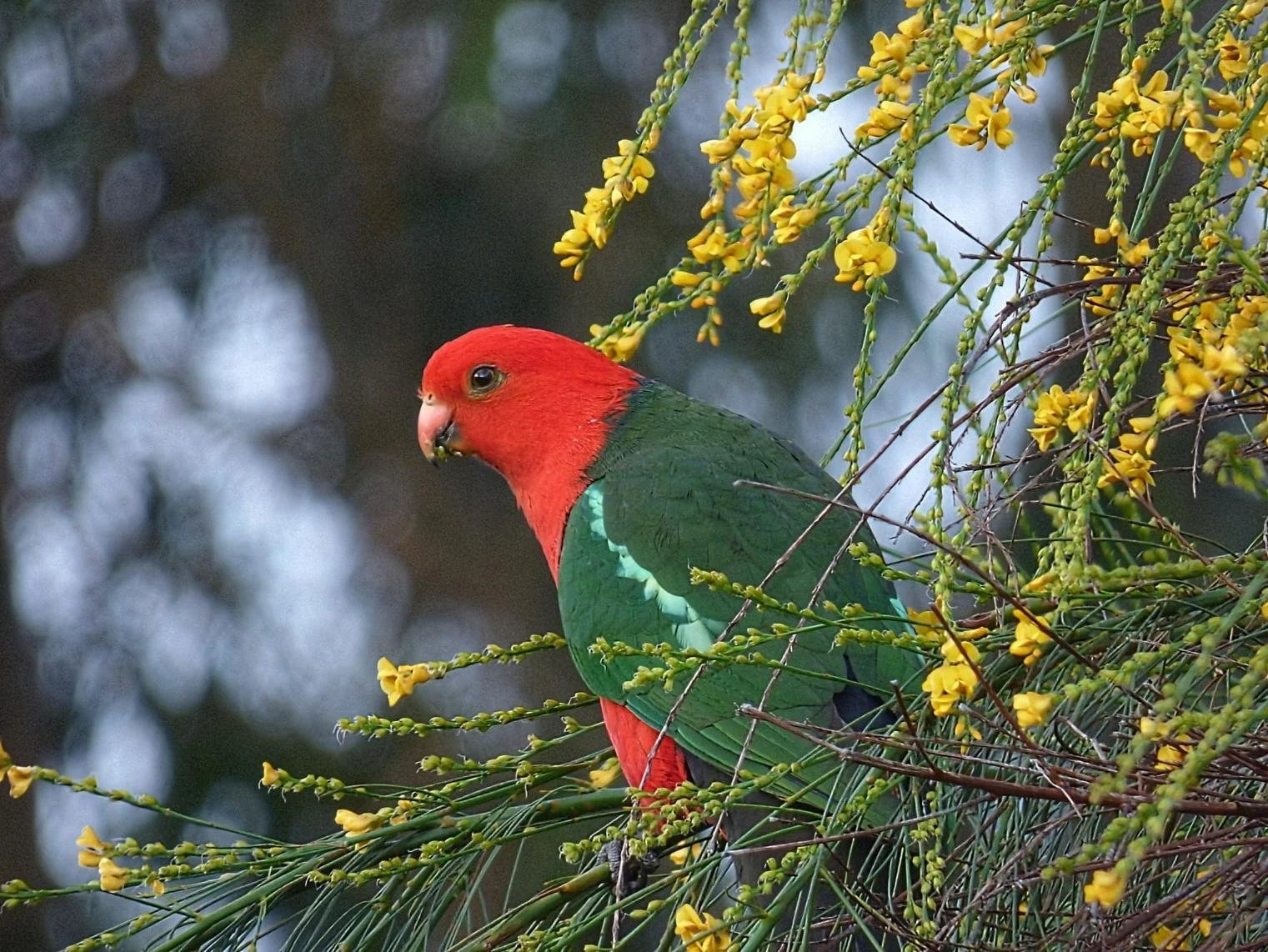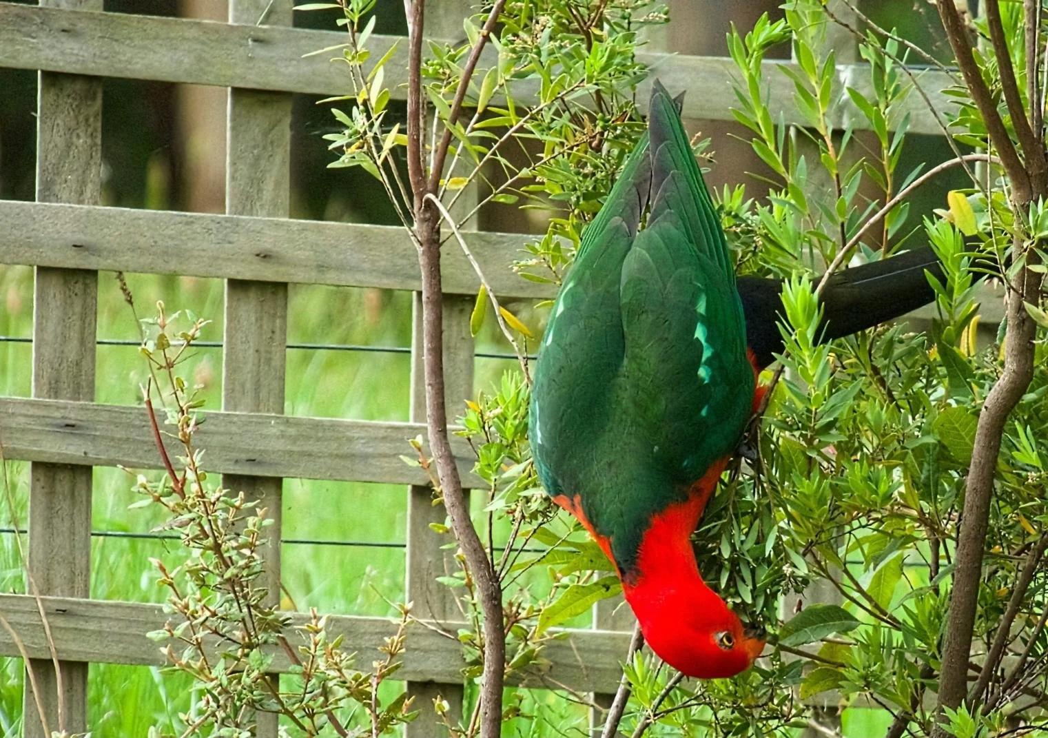 The male is beautiful, coloured bright red and green, while the female is predominantly green.