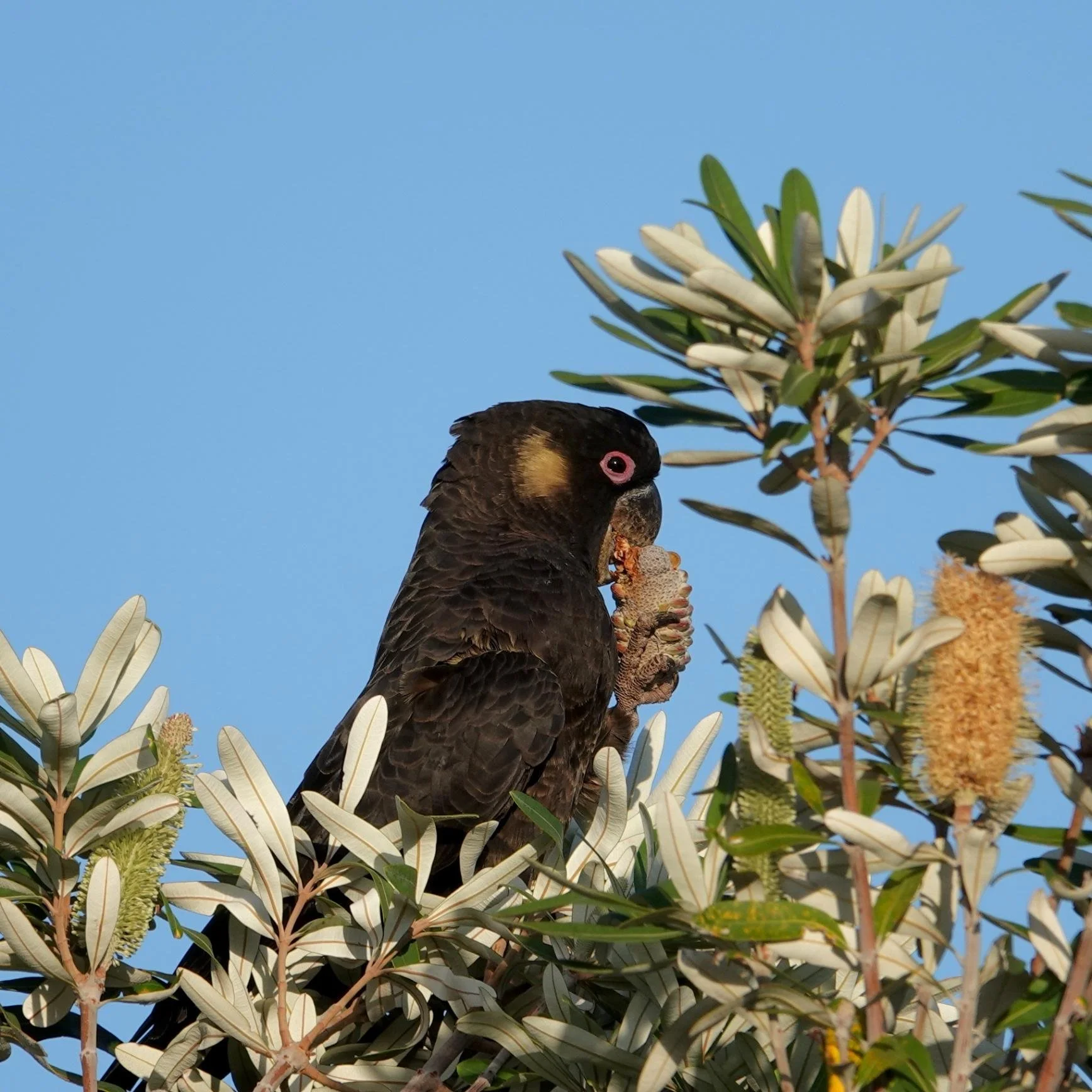 The largest of the different species of cockatoos seen locally, these very large black birds have yellow patches on their faces and tails.