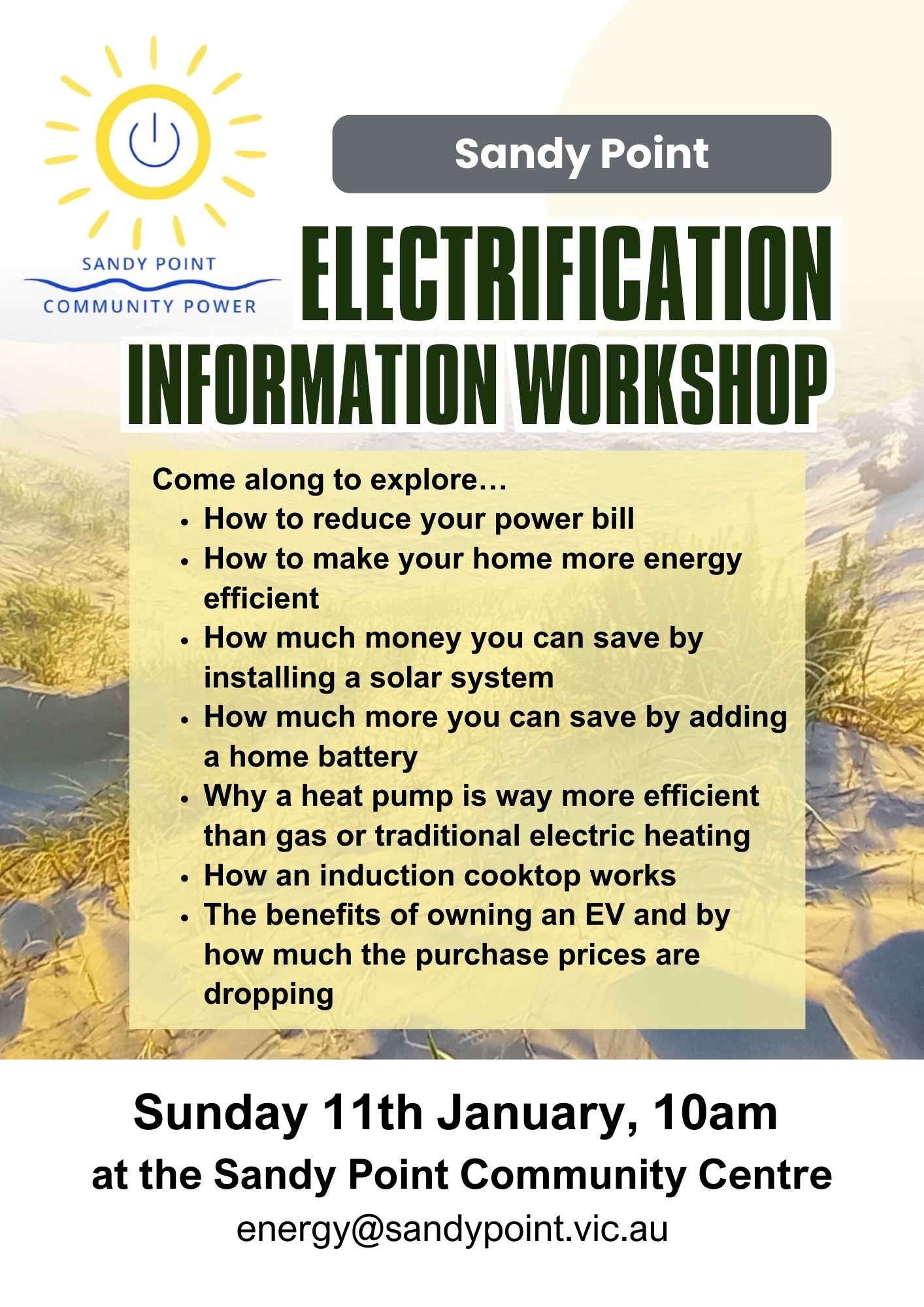 During the workshop we’ll demonstrate how to get a better energy deal by using the Vic Gov Energy Compare website. We’ll also demonstrate how to use another website to show how much you can save by installing a solar and battery system on your house, and switching to electrical hot water heating.
