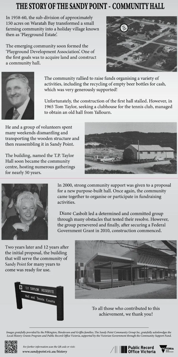 In February 2022 SPCG was successful in applying for a grant to fund historical signs reflecting European settlement in Sandy Point. These signs can be found in the T. P. Taylor Reserve adjacent to the Community Centre. The signs are themed: The Playground of the South, People and Community, and Community Hall.